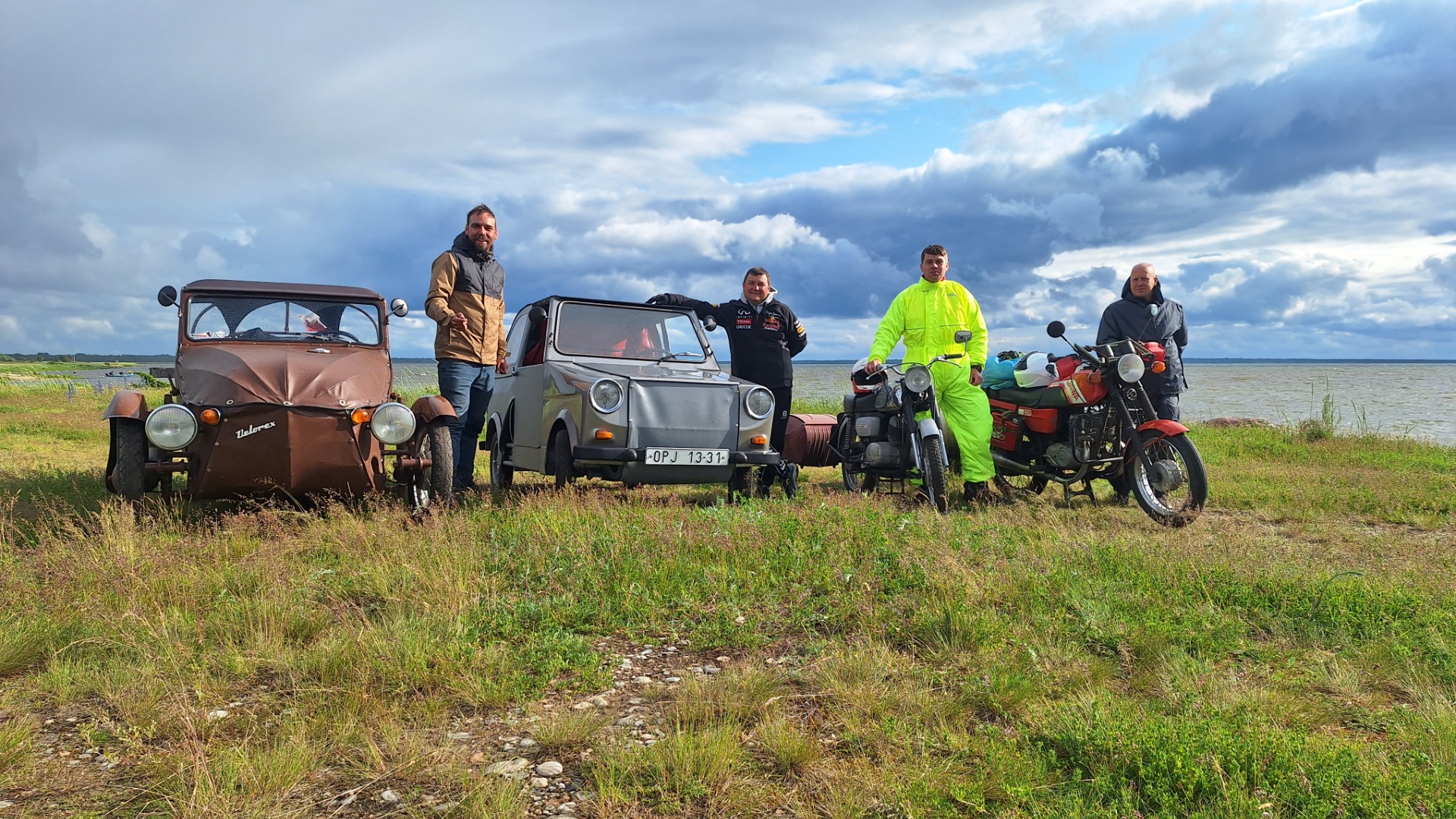 Počasí se konečně umoudřílo, teplo teda není, to ne, ale už aspoň neprší. Jsme v Paldisky, je 17:30 a to je skvělí čas na to, čím jsme sem dojeli a čím projeli . Děláme rychle fotky na pobřeží a jedeme do přístavu. Jsme netrpěliví jestli se vlezeme na trajekt. Vlezeme! Tady asi nikdo moc lístky dopředu neřeší. Čím víc se blíží doba vyplutí, tím delší fronta na lístky je. Po odplutí vidíme na palubě, že jsme úplně narvaní a nevešla by se navíc snad ani jedna motorka. Ale to předbíhám, ještě nejsme na palubě, musíme si projít obligátní debatou zda je Velorex motorka nebo auto.